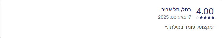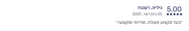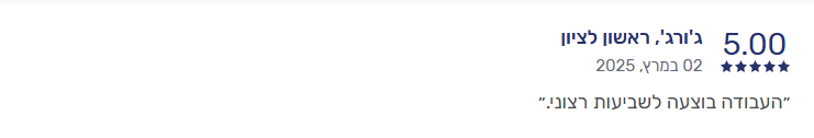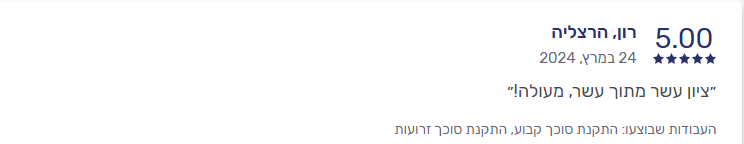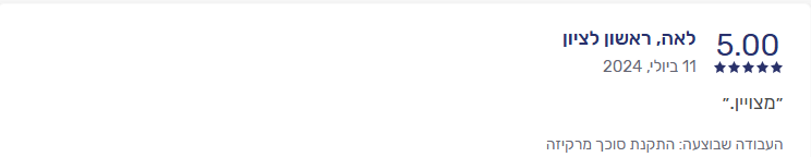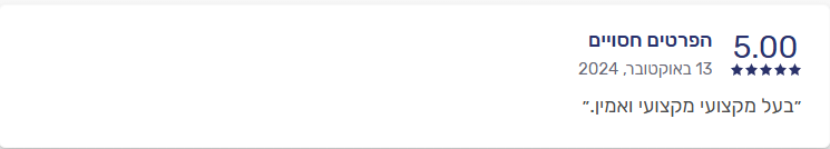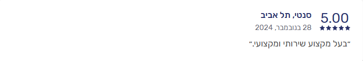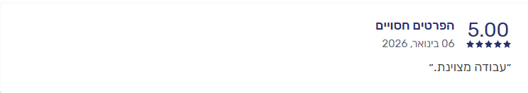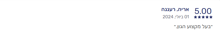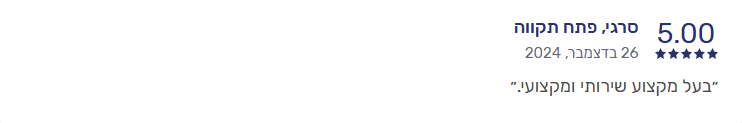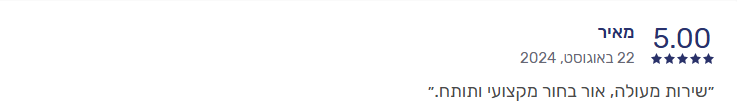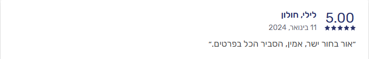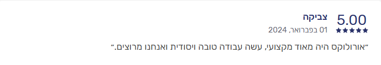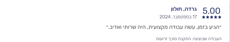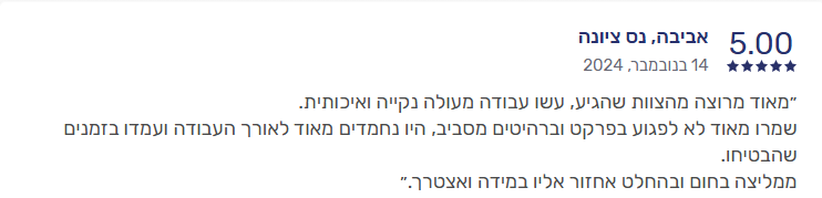 מְעוּלֶה מבוסס על 10 ביקורות פורסם ב- gilad roeslerTrustindex מוודא שהמקור המקורי של הסקירה הוא Google. התקין אצלי סוכך זרועות. שירות טוב וסבלני. מחיר הוגן. ממליץ מאודפורסם ב- noga rogelTrustindex מוודא שהמקור המקורי של הסקירה הוא Google. פורסם ב- יוסי אלוןTrustindex מוודא שהמקור המקורי של הסקירה הוא Google. השירות של אור היה די מהיר, נתן לי הצעת מחיר ולמחרת הגיע להתקין. השירות היה מקצועי, נתן לי אחריות ל-3 שנים. אני ממליץ בחוםפורסם ב- Lital RozoanskiTrustindex מוודא שהמקור המקורי של הסקירה הוא Google. אור נתן שירות מקצועי, אמין ויעיל! התקין סוכך מרקיזה בבית הוריי, מחיר טוב וברמת איכות הכי גבוהה שיש, אפילו הגיע פעם נוספת להסביר לנו איך לפתוח את הפרגולה והיה מאוד סבלני. תודה רבה!פורסם ב- Meir YechieliTrustindex מוודא שהמקור המקורי של הסקירה הוא Google. קיבלנו מאור שירות מעולה והעבודה הייתה מדויקתפורסם ב- Ilan IlaniTrustindex מוודא שהמקור המקורי של הסקירה הוא Google. איש מקצוע מעולה והגון.פורסם ב- Roni KimhiTrustindex מוודא שהמקור המקורי של הסקירה הוא Google. אור מקצועי, אמין וזמין לכל אורך הדרך! קיבלנו שירות ברמה הגבוהה ביותר – החל מהמוצר, דרך הזמנים ועד להתקנה שהייתה מקצועית עם צוות מצוין. תודה רבה על הליווי והשירות!פורסם ב- עדי רוט - אסףTrustindex מוודא שהמקור המקורי של הסקירה הוא Google. אור הגיע, חשב איתי על הצרכים והפתרונות. התאים את מועד ההתקנה לזמן שמתאים לי. לא יכל להגיע במועד שנקבע להתקנה, עדכן, הציע פיצוי כספי מיוזמתו בשל הביטול ותאם עימי מועד התקנה חדש סמוך למועד הקודם. להתקנה הגיע עם חשמלאי והיא בוצעה, לשביעות רצוני, תוך זכירת הדברים שסיכמנו והיוועצות היכן שצריך. התוצר נעים מאוד. תודה לאורפורסם ב- שובל גוהריאןTrustindex מוודא שהמקור המקורי של הסקירה הוא Google. הזמנתי את אור להתקנה בבית הוריי בחולון. שירות אמין ומהיר והיה גמיש במחיר תודהפורסם ב- Silya STrustindex מוודא שהמקור המקורי של הסקירה הוא Google. מאומת על ידי Trustindexתעודת האימות של Trustindex היא סמל האמון האוניברסלי. רק החברות הטובות ביותר יכולות לקבל את התעודה המאומתת עם דירוג מעל 4.5, בהתבסס על ביקורות לקוחות במהלך 12 החודשים האחרונים. קרא עוד
