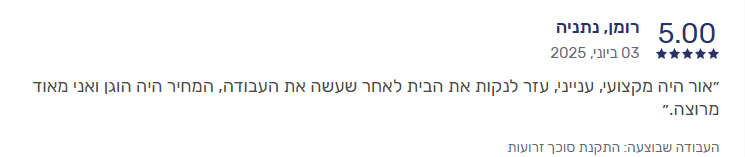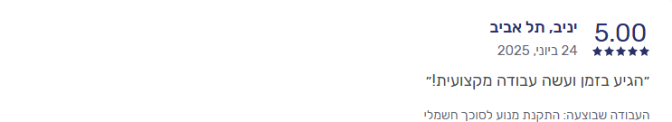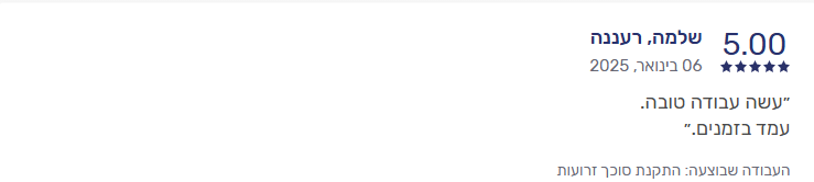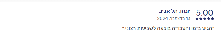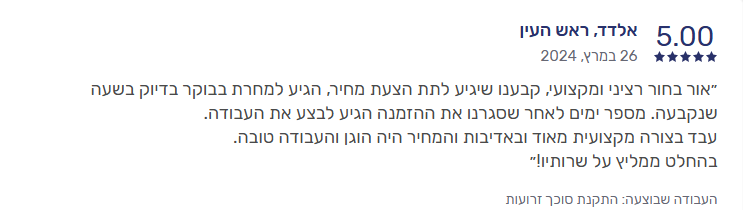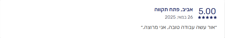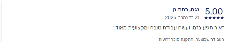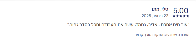 ״אור בחור רציני ומקצועי, קבענו שיגיע לתת הצעת מחיר, הגיע למחרת בבוקר בדיוק בשעה שנקבעה. מספר ימים לאחר שסגרנו את ההזמנה הגיע לבצע את העבודה. עבד בצורה מקצועית מאוד ובאדיבות והמחיר היה הוגן והעבודה טובה. בהחלט ממליץ על שרותיו!״
